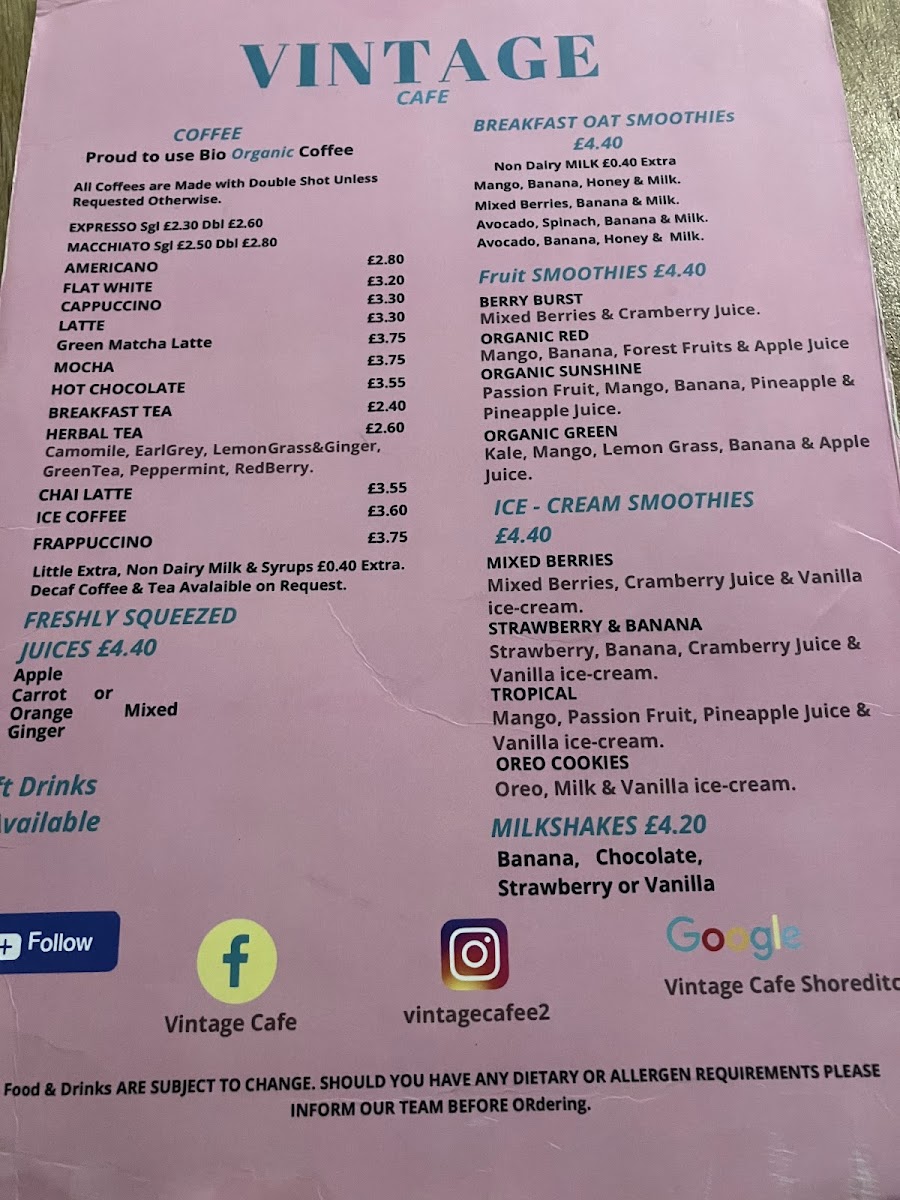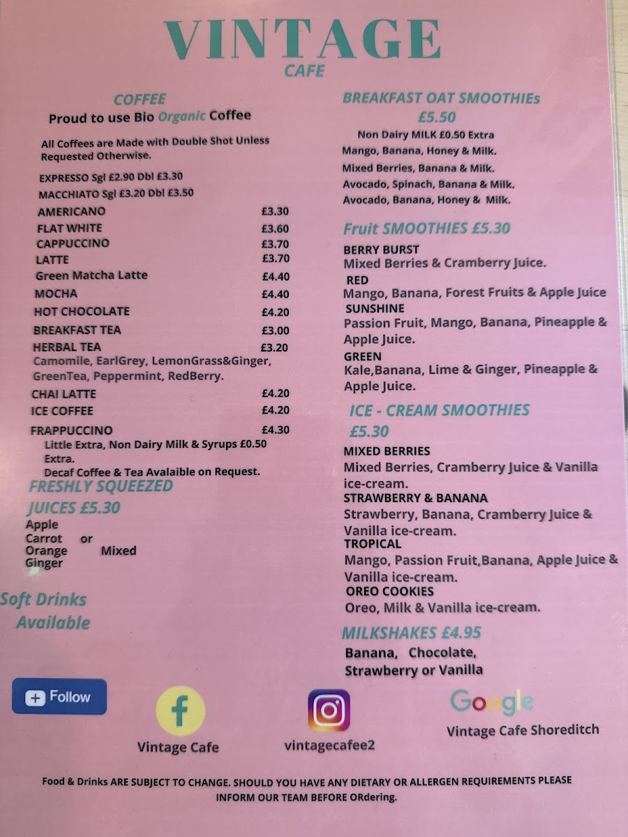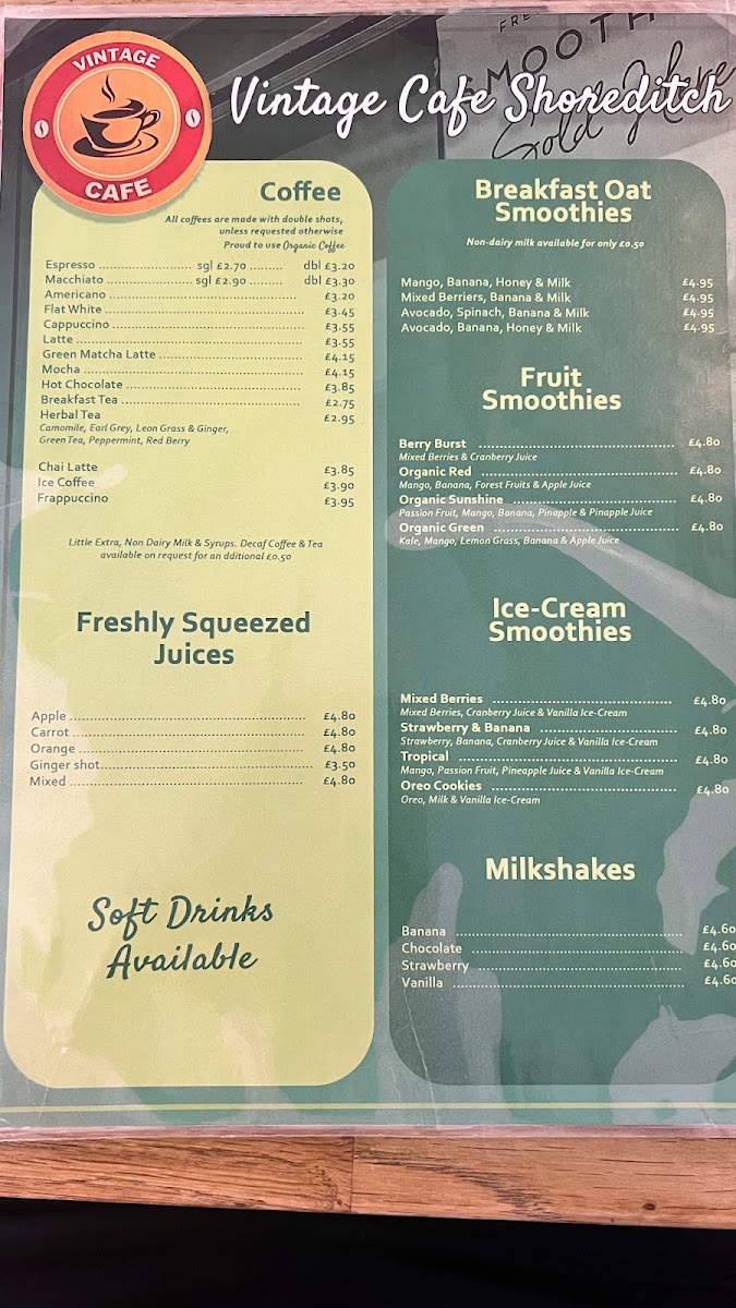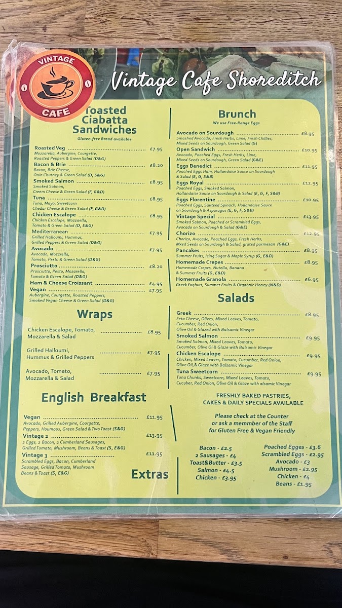 In conclusion, Vintage Café Shoreditch offers a memorable culinary experience with its exceptional menu, high-quality coffee, and inviting atmosphere. Whether you're stopping by for a quick coffee or a leisurely brunch, it’s a place that will surely leave you wanting to return.